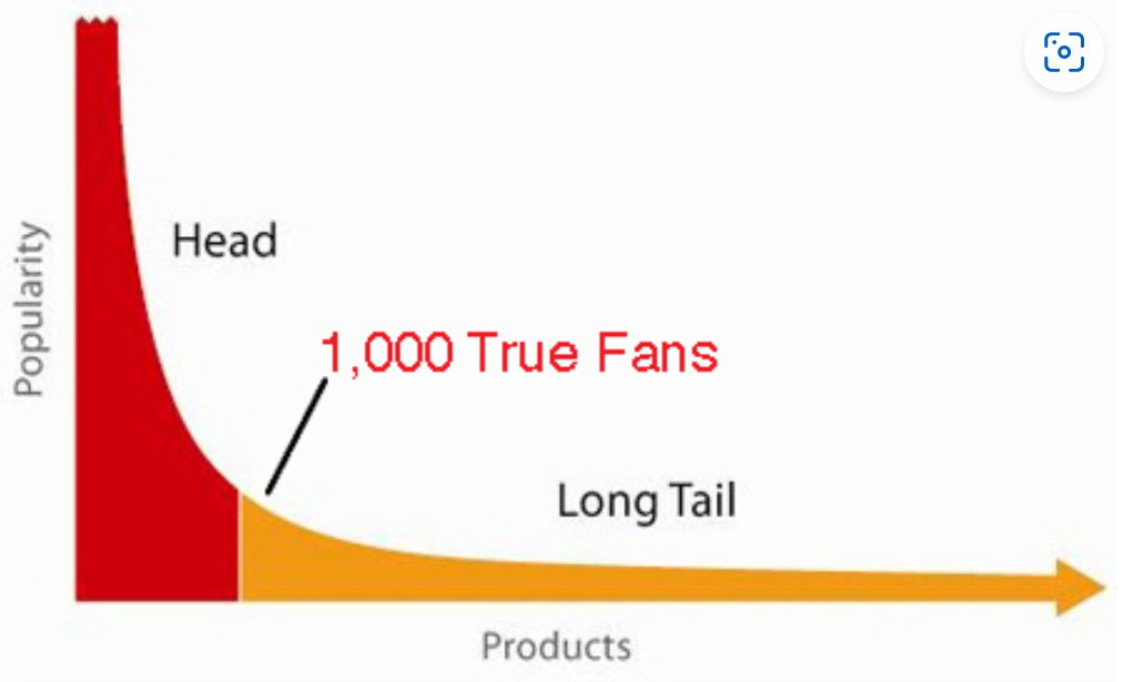 여기서 중요한 것이 있습니다. 대기업, 중간 기업, 상업 생산자들은 이런 1000명의 진정한 팬들과 연결하기에는 적합하지 않습니다. 그들은 조직의 본질에 따라 틈새 시장과 소비자를 찾고 제공할 수 없습니다. 그것은 롱테일이란 크리에이터인 당신에게 활짝 열려 있다는 것을 의미합니다. 당신은 백만 명 중 한 명의 진정한 팬을 갖게 될 것입니다. 그리고 최근 소셜 미디어의 혁신을 포함하여 연결을 위한 도구는 계속해서 개선되고 있습니다. 1,000명의 진정한 팬들을 크리에이터 주변에 모으는 것이 그 어느 때보다 쉽고, 그들을 가까이 두는 것이 더 쉽습니다.